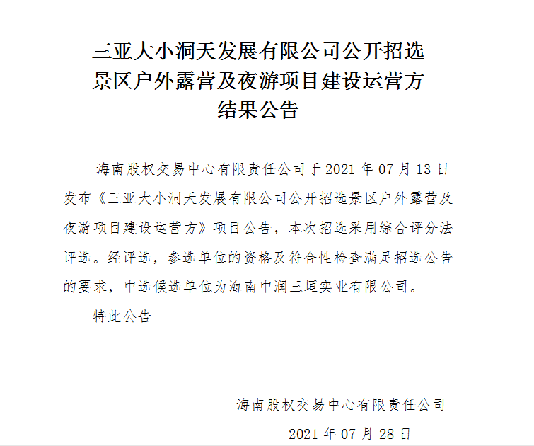 三亞大小洞天發(fā)展有限公司公開(kāi)招選景區(qū)戶(hù)外露營(yíng)及夜游項(xiàng)目建設(shè)運(yùn)營(yíng)方結(jié)果公告