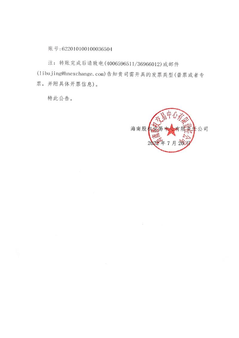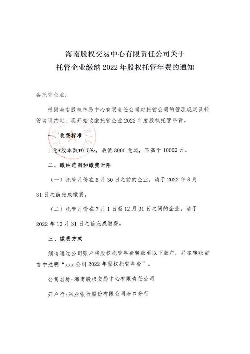 海南股權(quán)交易中心有限責(zé)任公司關(guān)于托管企業(yè)繳納2022年股權(quán)托管年費(fèi)的通知