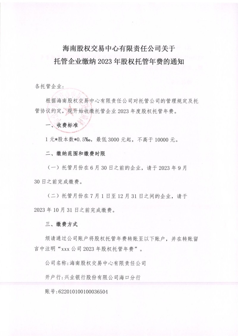 海南股權(quán)交易中心有限責(zé)任公司關(guān)于托管企業(yè)繳納2023年股權(quán)托管年費(fèi)的通知