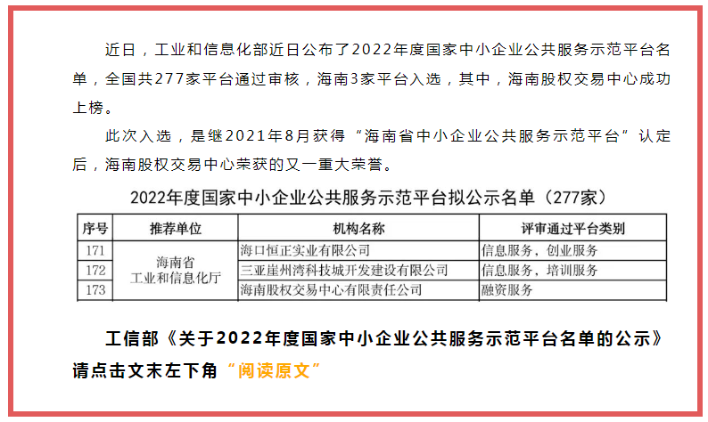 此次獲評國家中小企業(yè)公共服務示范平臺,是對海南股權(quán)交易中心服務省內(nèi)中小微企業(yè)工作的認可,也是對海南股權(quán)交易中心未來開展各項培育、融資和創(chuàng)新服務舉措的極大鼓舞。