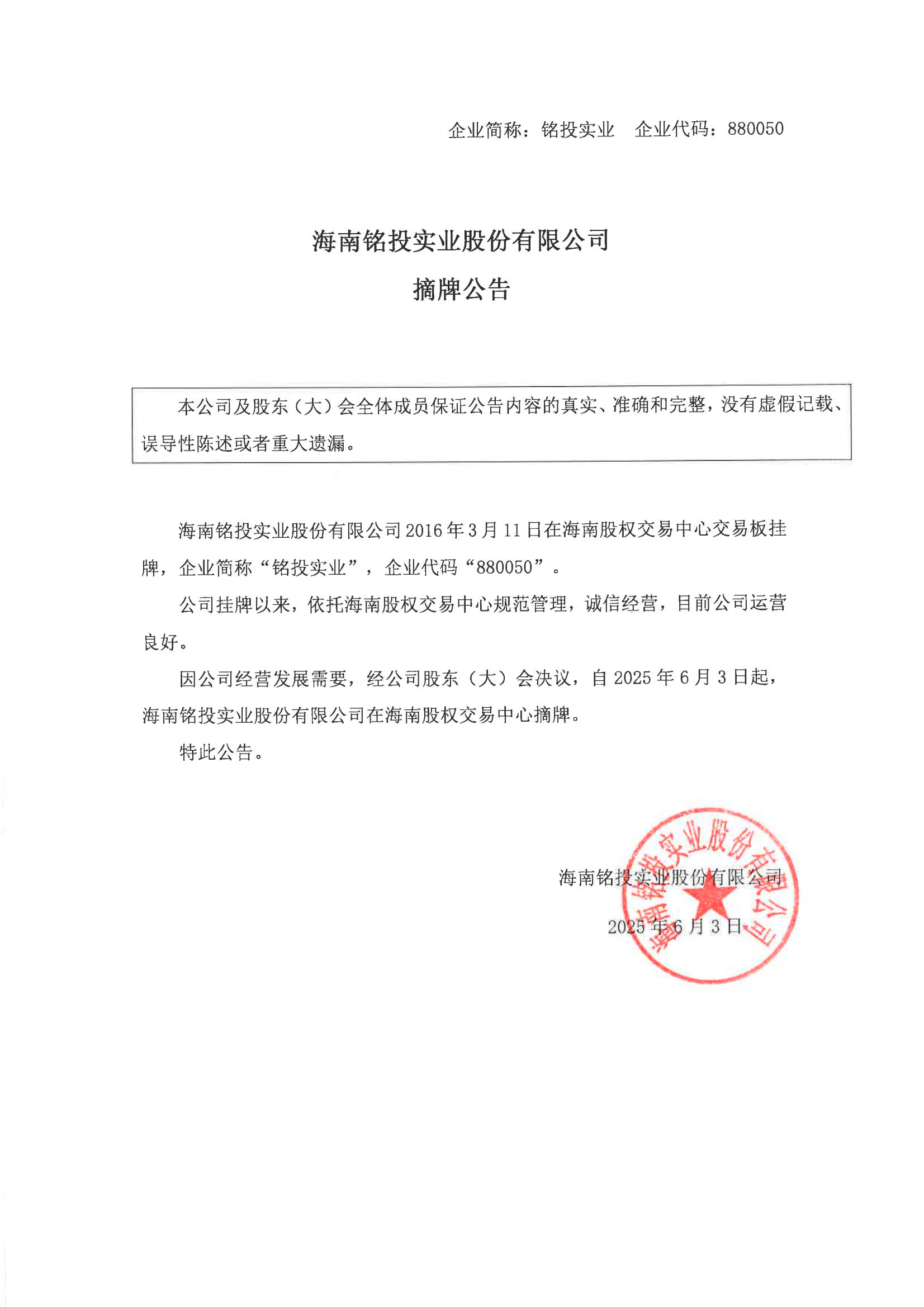 海南銘投實(shí)業(yè)股份有限公司摘牌公告